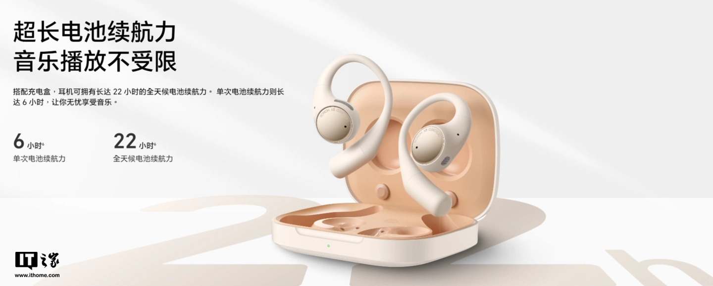 该款耳机单次续航能力为 6 小时,搭配耳机盒使用续航约 22 小时,宣称支持“超级快充”:充电 15 分钟,播放 2 小时。