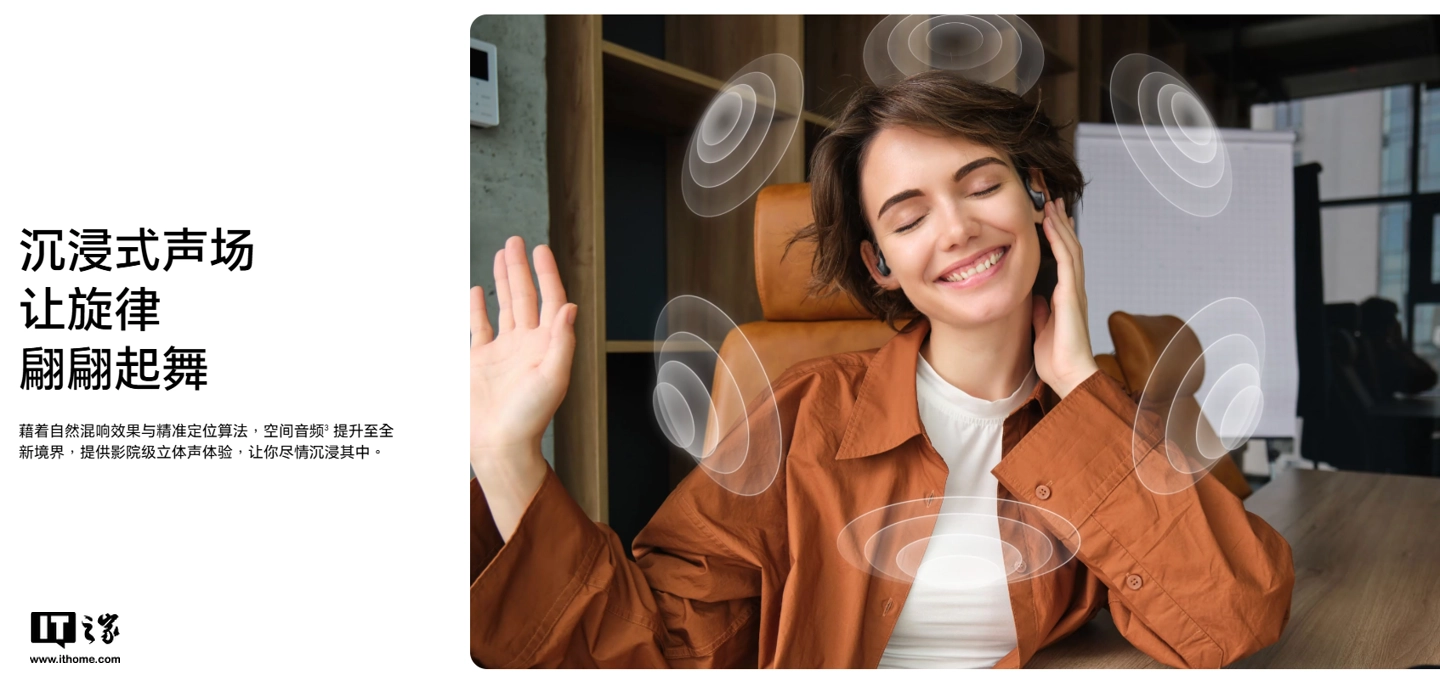 该耳机行业首发双低音算法,通过瞬态增强算法和动态低音补偿算法,打造“专属耳边音乐厅”,行业首发 3+1 麦克风开放式降噪,配备隐私防漏音技术,提升嘈杂环境下的语音清晰度与通话私密性。