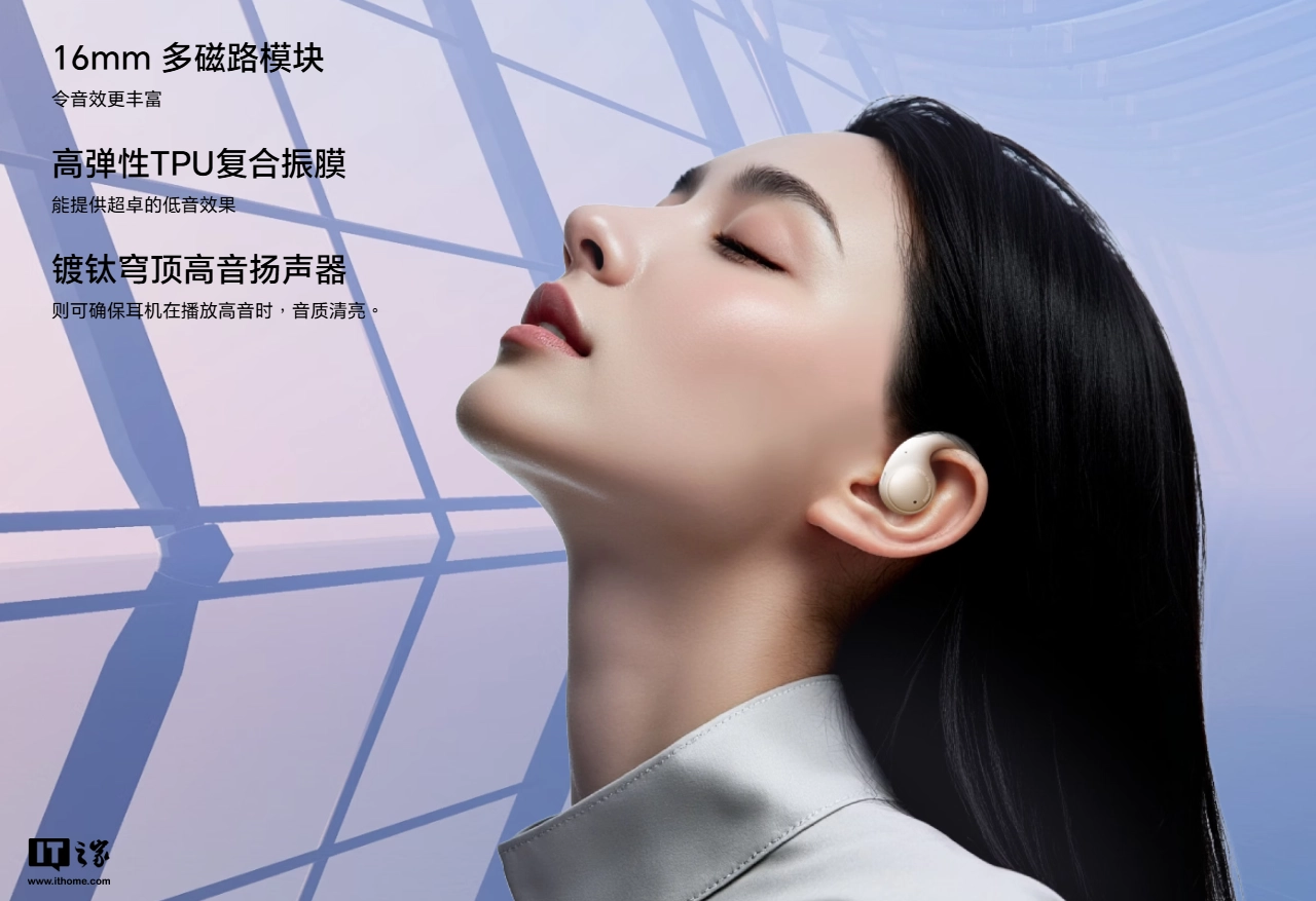 荣耀 Earbuds 开放式耳机与此前在香港官网上架的荣耀 Earbuds Open 耳机外观基本一致。该款耳机配备 16mm 多磁路模块 + 高弹性 TPU 复合振膜,内置镀钛穹顶高音扬声器,支持自然混响效果、空间音频等功能。